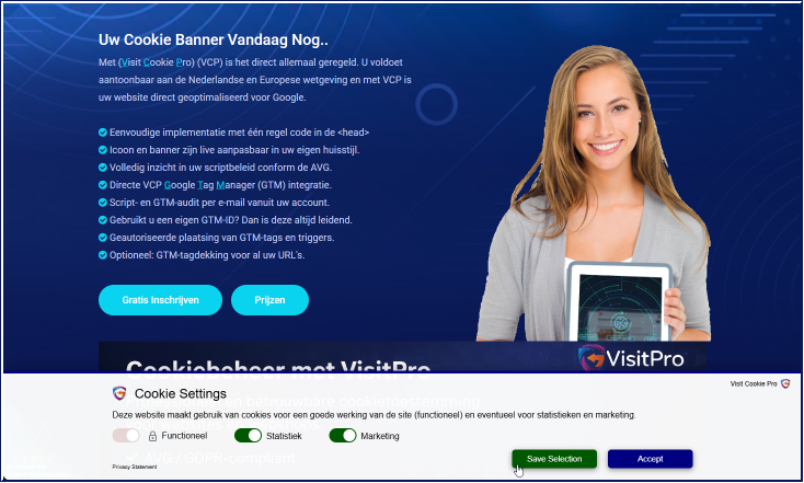Veiligheid en naleving van de privacywetgeving staan ook binnen onze cookiebanner centraal. De oplossing zorgt ervoor dat alle toestemmingen correct worden geregistreerd en verwerkt, volledig in overeenstemming met de AVG/GDPR. Cookie- en trackerinformatie wordt transparant weergegeven, terwijl beveiligde opslag en automatische updates bijdragen aan een betrouwbare en compliant website. Zo waarborgt u niet alleen de privacy van uw bezoekers, maar ook de integriteit van uw digitale omgeving.